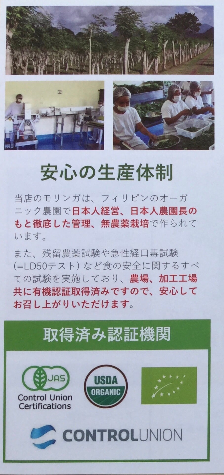 当店のモリンガはフィリピンのオーガニック農園で日本人経営、日本人農園長のもと、徹底した管理で作られています。